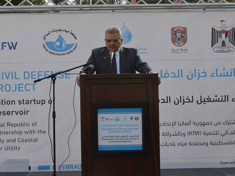 غزة- افتتح رئيس سلطة المياه م. مازن غنيم خزّان الدفاع المدني/ تل الهوا، بسعة 3000 متر مكعب، والممول من بنك التنمية الألماني بقيمة 920 ألف يورو، وذلك بهدف تحسين خدمة توزيع المياه لأكثر من 250 ألف مواطن في مدينة غزة.