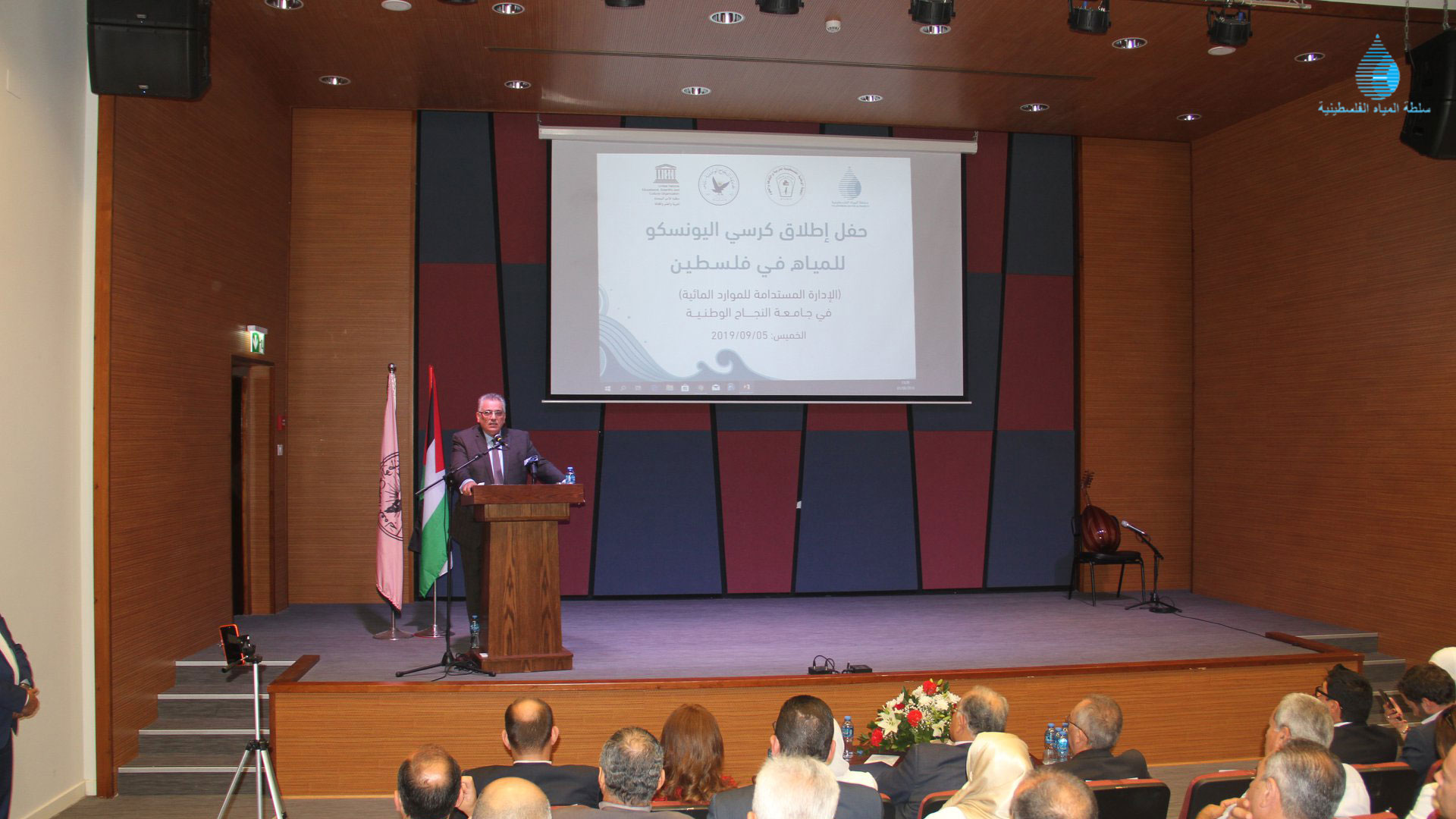 كما توجه م. غنيم بالتهنئة لجامعة النجاح لحصولها على كرسي اليونيسكو ، والذي يعتبر الأول في فلسطين، ويؤسس لتشجيع الحوار الإقليمي والعالمي في مجال هيدرولوجيا المياه وإدارة مصادر المياه المتكاملة، مشيداً بنموذج التكامل ما بين سلطة المياه ومنظمة اليونيسكو واللجنة الوطنية للتربية والثقافة والعلوم والتي أفضت عن تحقيق فوز فلسطين في انشاء كرسي اليونيسكو للمياه. كما ثمن دور منظمة اليونيسكو، في المساهمة بإحلال السلام والأمن عن طريق رفع مستوى التعاون بين دول العالم في مجالات التربية والتعليم والثقافة لإحلال الاحترام العالمي للعدالة ولسيادة القانون ولحقوق الإنسان ومبادئ الحرية الأساسية الأمر الذي نعتبره في فلسطين غاية في الأهمية. ولاهتمامهم بإنشاء هذه الكراسي التي تعتبر منصات للتواصل، بهدف التوأمة مع الجامعات وإقامة شبكات تعاون بين مؤسسات التعليم العالي. وايجاد أداة أساسية لبناء قدرات المؤسسات الأكاديمية من خلال تبادل المعارف. والأهم تشجيع التعاون البناء لخدمة تطوير القطاع ورفع قدرات مؤسساته.
