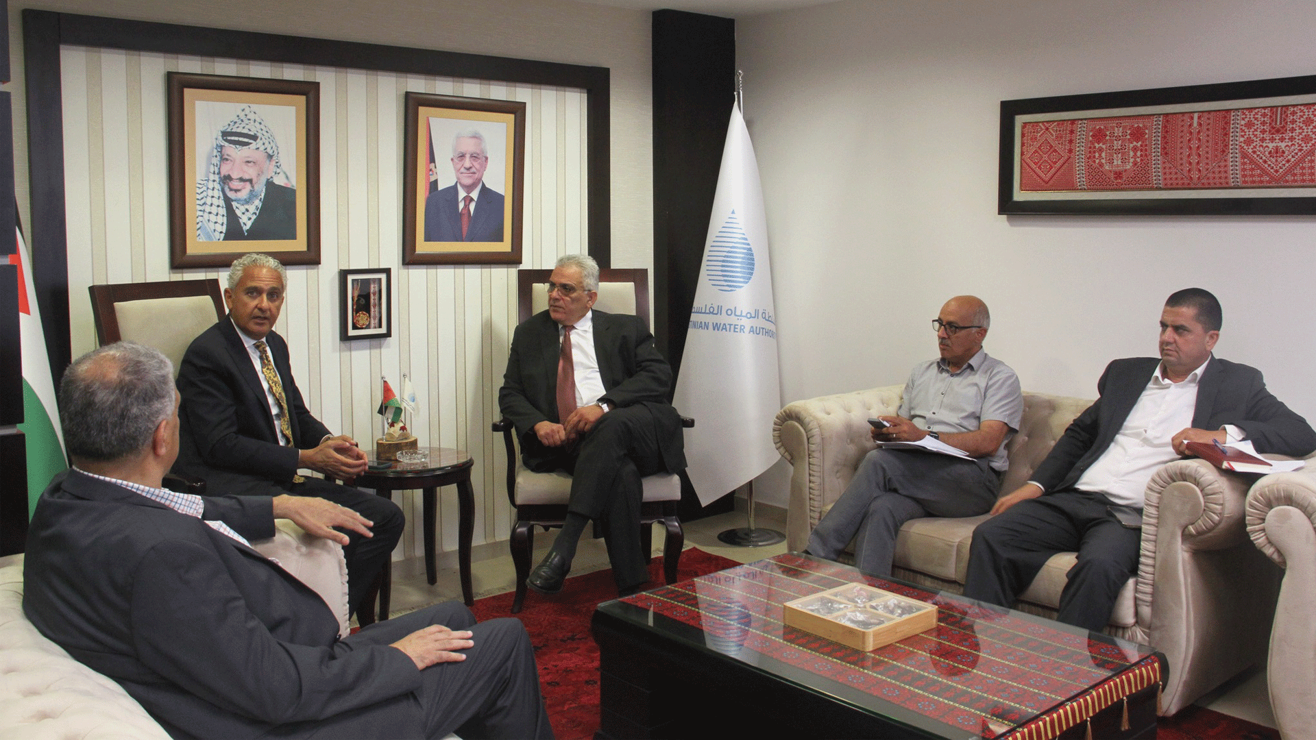 كما تطرق اللقاء الى بحث الازمة المائية التي تشهدها جميع محافظات الوطن وتحديدا محافظة رام الله نتيجة تعمد الاحتلال تقليص كميات المياه، حيث أكد الوزير غنيم ان سلطة المياه تتابع منذ بداية تقليص الجانب الإسرائيلي لكميات المياه وتعمل على إدارة الازمة بالشكل الذي يضمن وصول المياه للمواطنين على الرغم من هذا التخفيض وما ينجم عنه تذبذب في ضغط المياه مما يؤدي الى صعوبة نقل المياه الى المناطق المرتفعة، مضيفاً الى مشكلة أخرى في محافظة رام الله تتعلق بكثرة استخدام محطات الضخ الفردية وتجميع الخزانات فوق أسطح المنازل بشكل مبالغ فيه يؤدي الى حرمان المواطنين الاخرين من المياه.